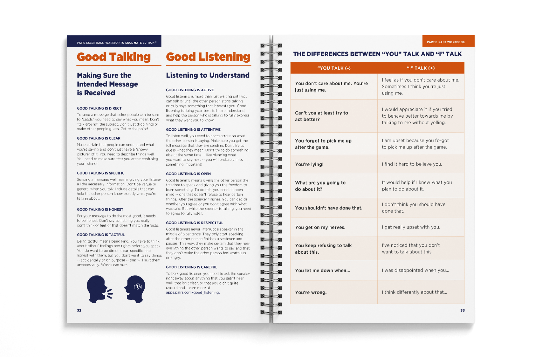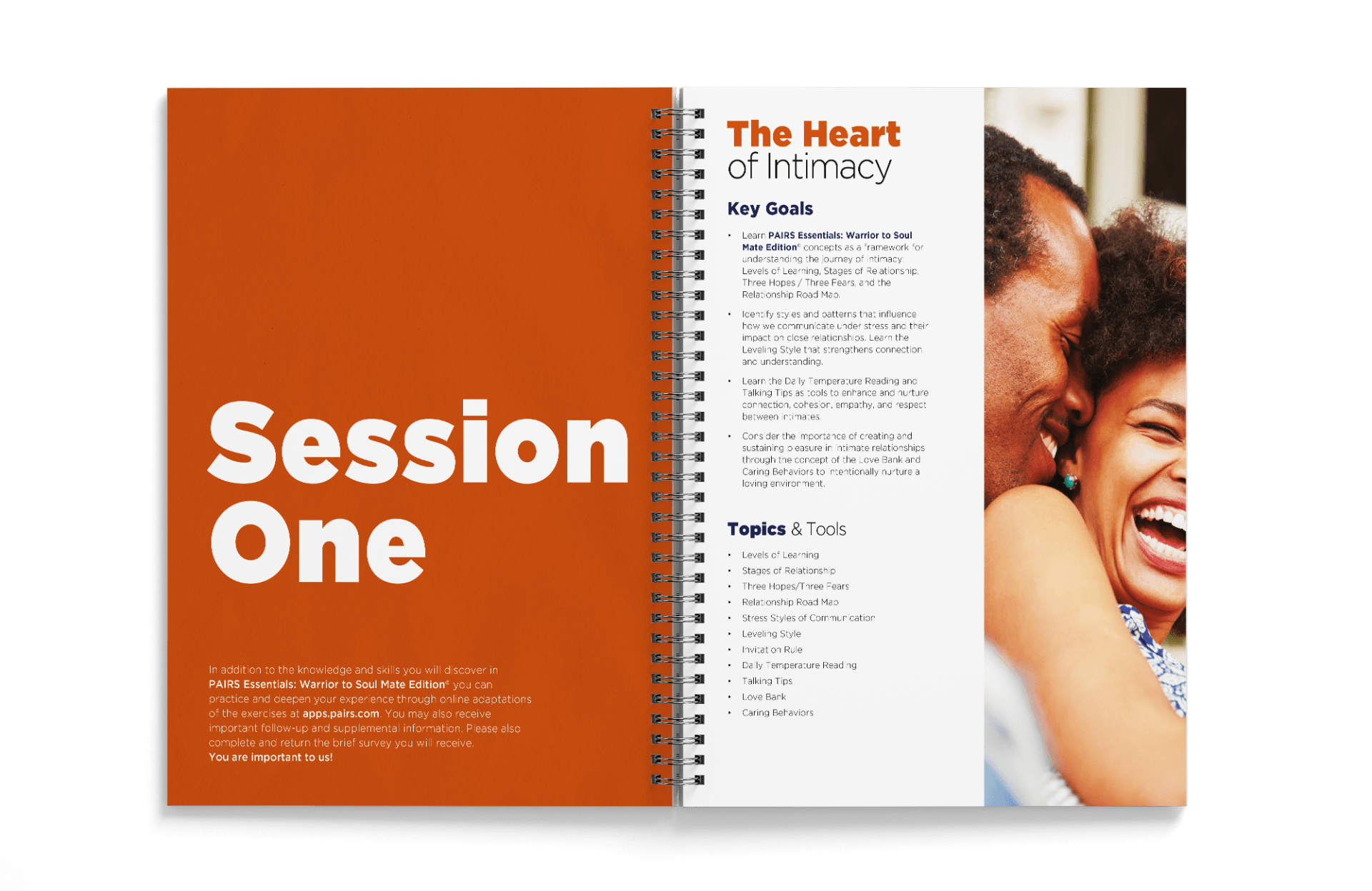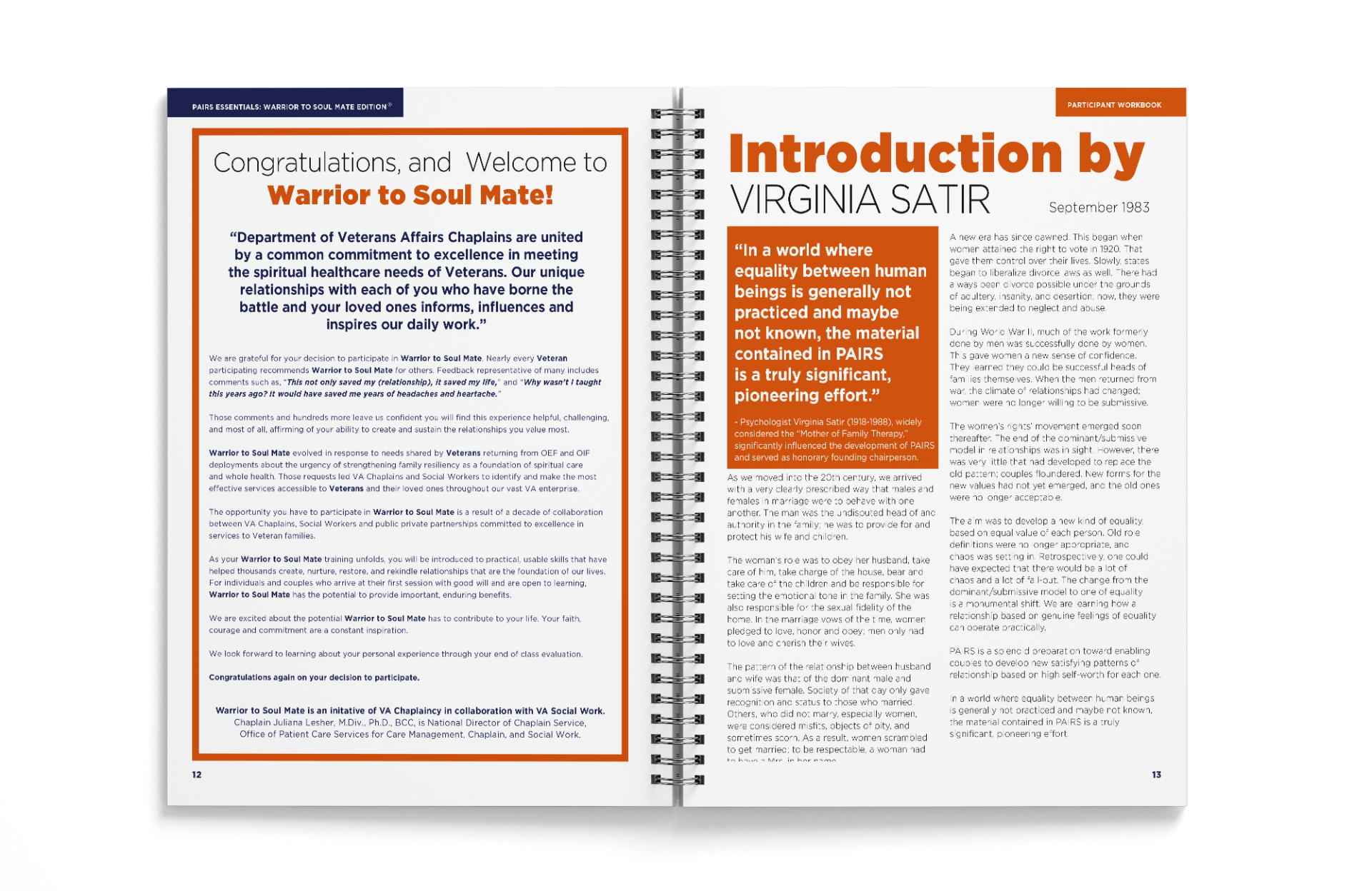 The Warrior to Soul Mate program is supported by the PAIRS Essentials: Warrior to Soul Mate Edition curriculum. It does not suggest, imply or endorse PAIRS as the only, best or exclusive provider of such materials for the Veterans Health Administration. The information on this website does not imply or regulate in any way how VA facilities should conduct relationship education as a proactive, preventative medical treatment and/or education venture.